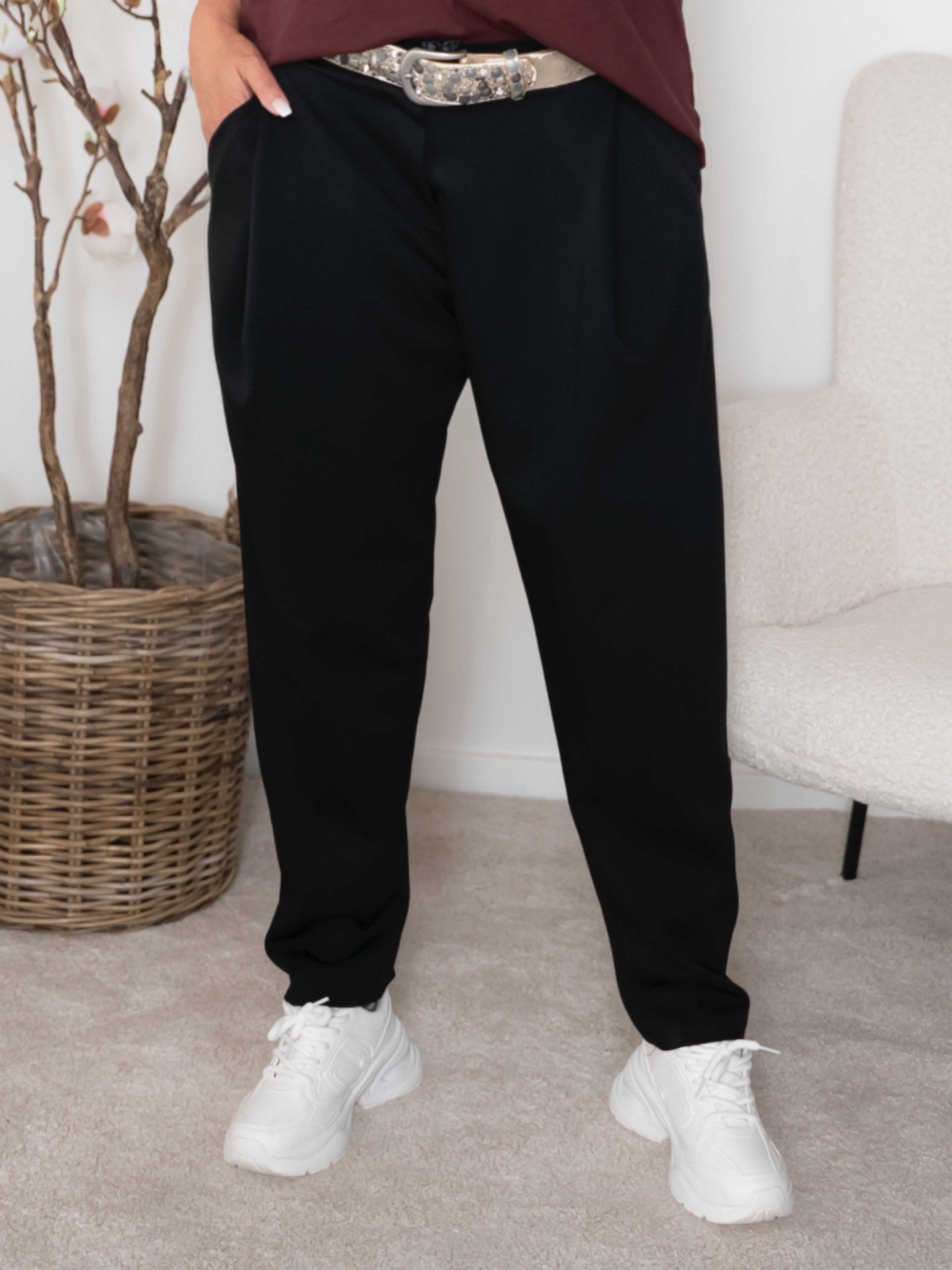 Disse bukser er den perfekte kombination af stil og komfort. De har en elegant, baggy pasform med let afsmalnede ben og en blød, strækbar kvalitet, der giver maksimal bevægelsesfrihed. Designet har elastik bagpå i taljen, så de sidder godt – samtidig med at de føles behagelige hele dagen.
