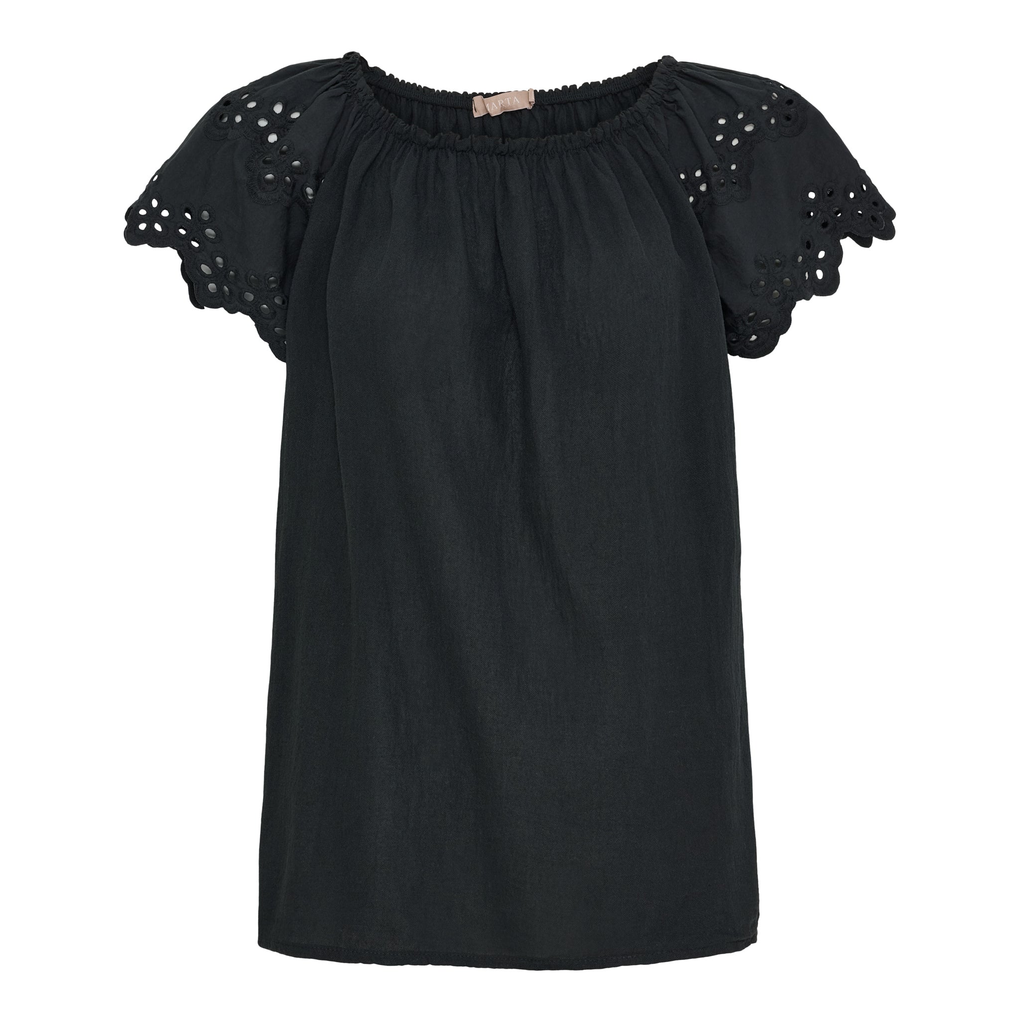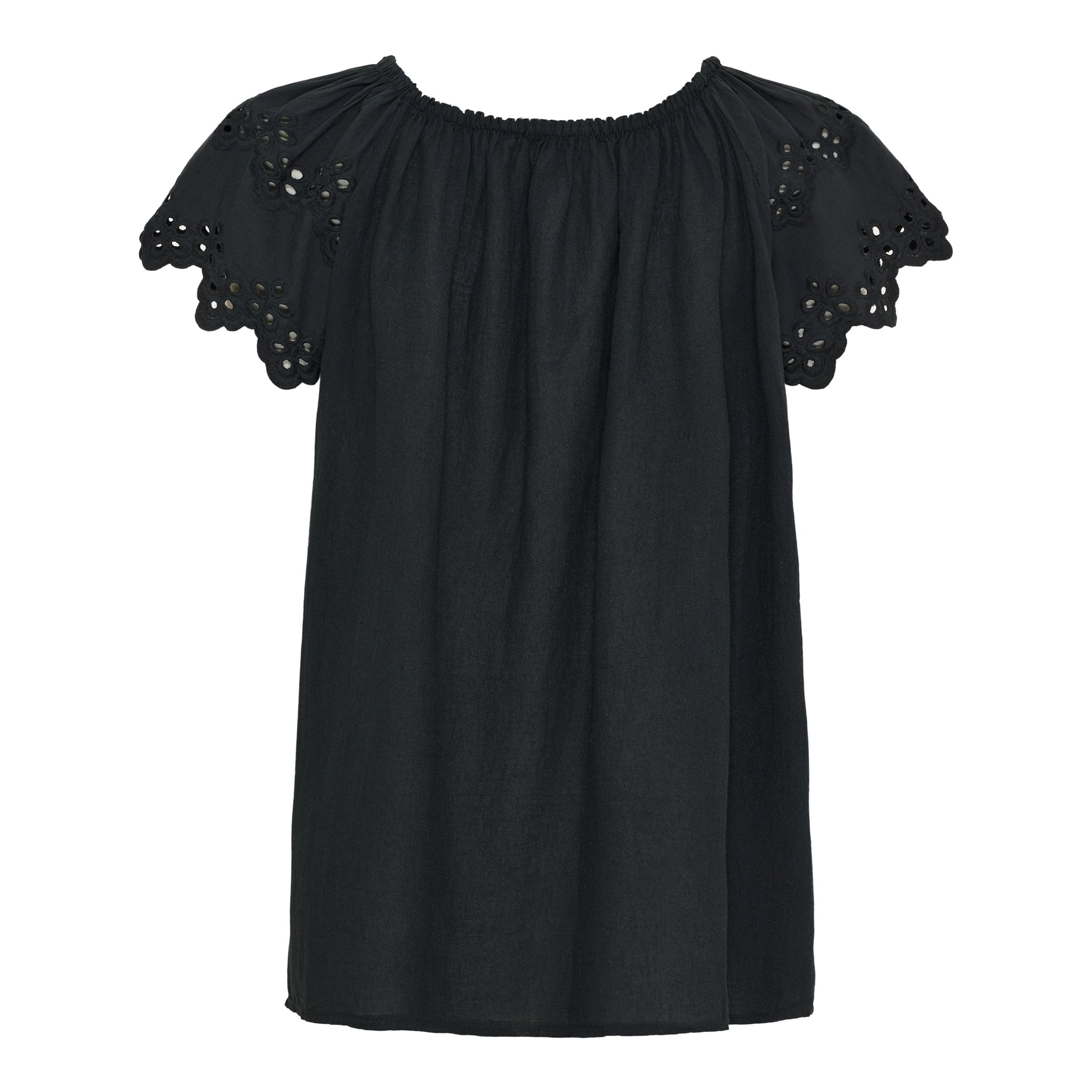 Denne top forener komfort og femininitet på smukkeste vis. Det bløde, luftige materiale falder let om kroppen, mens de korte ærmer med dekorativt broderi og udskæringer tilføjer et elegant og romantisk twist.