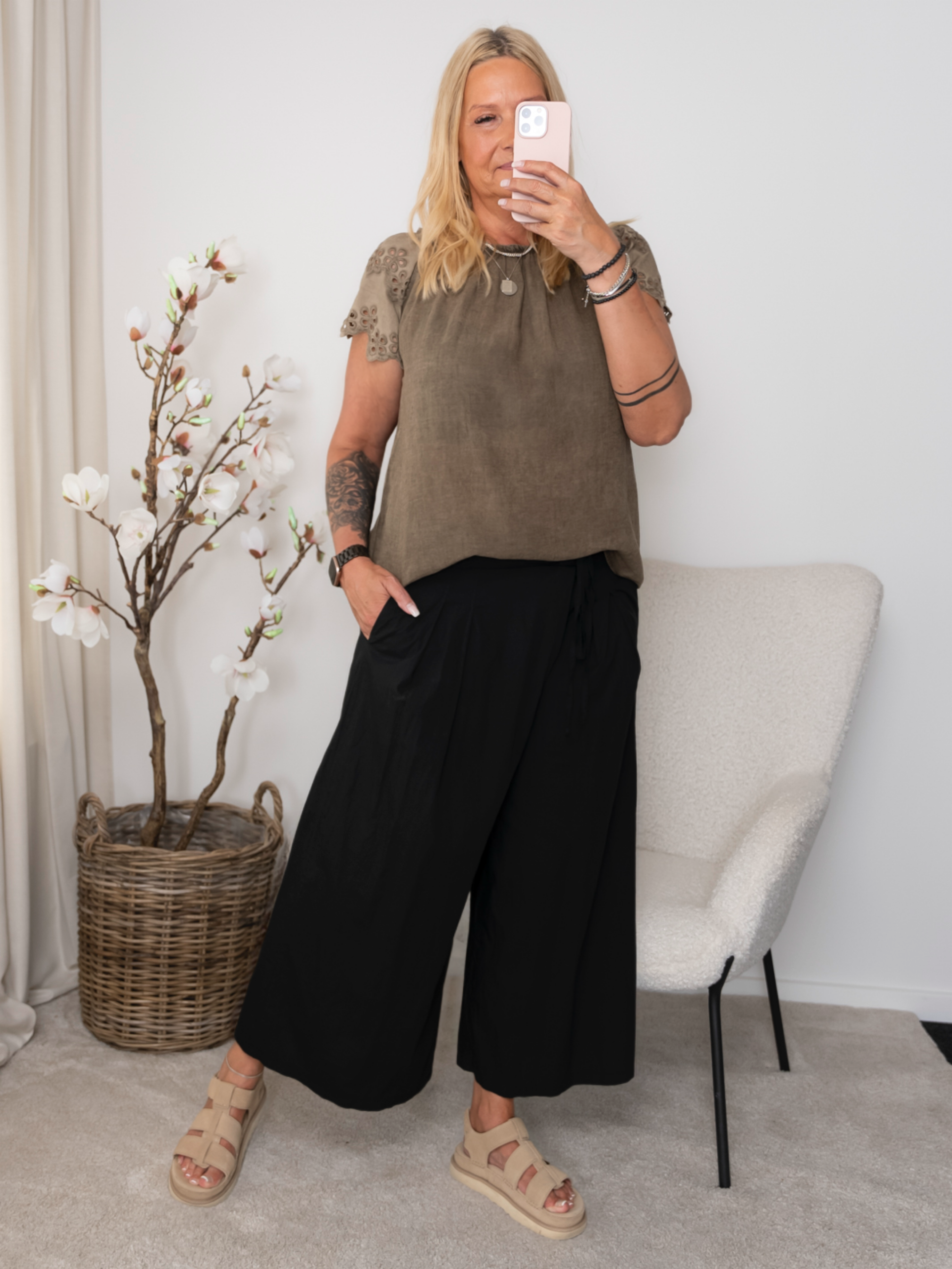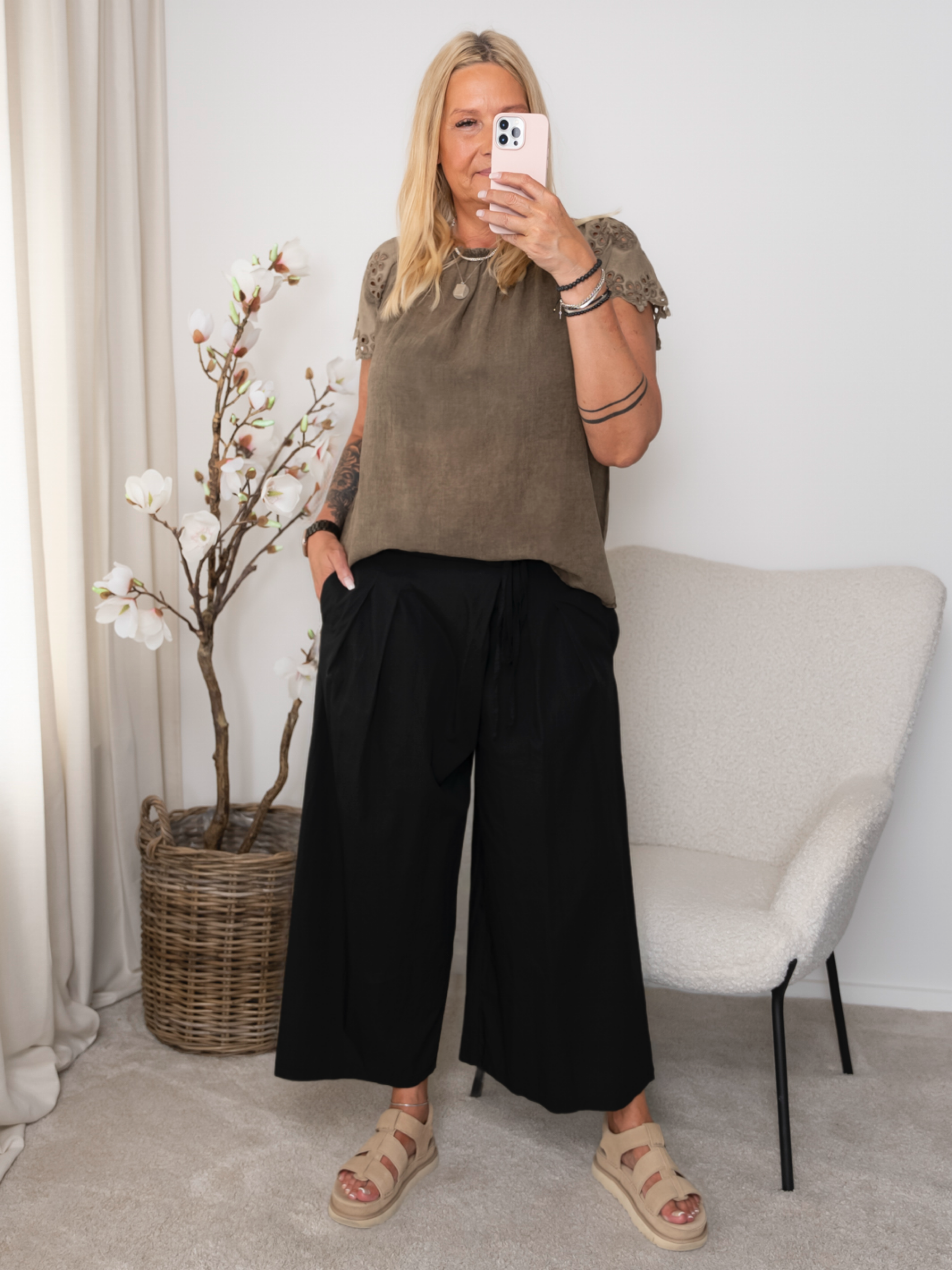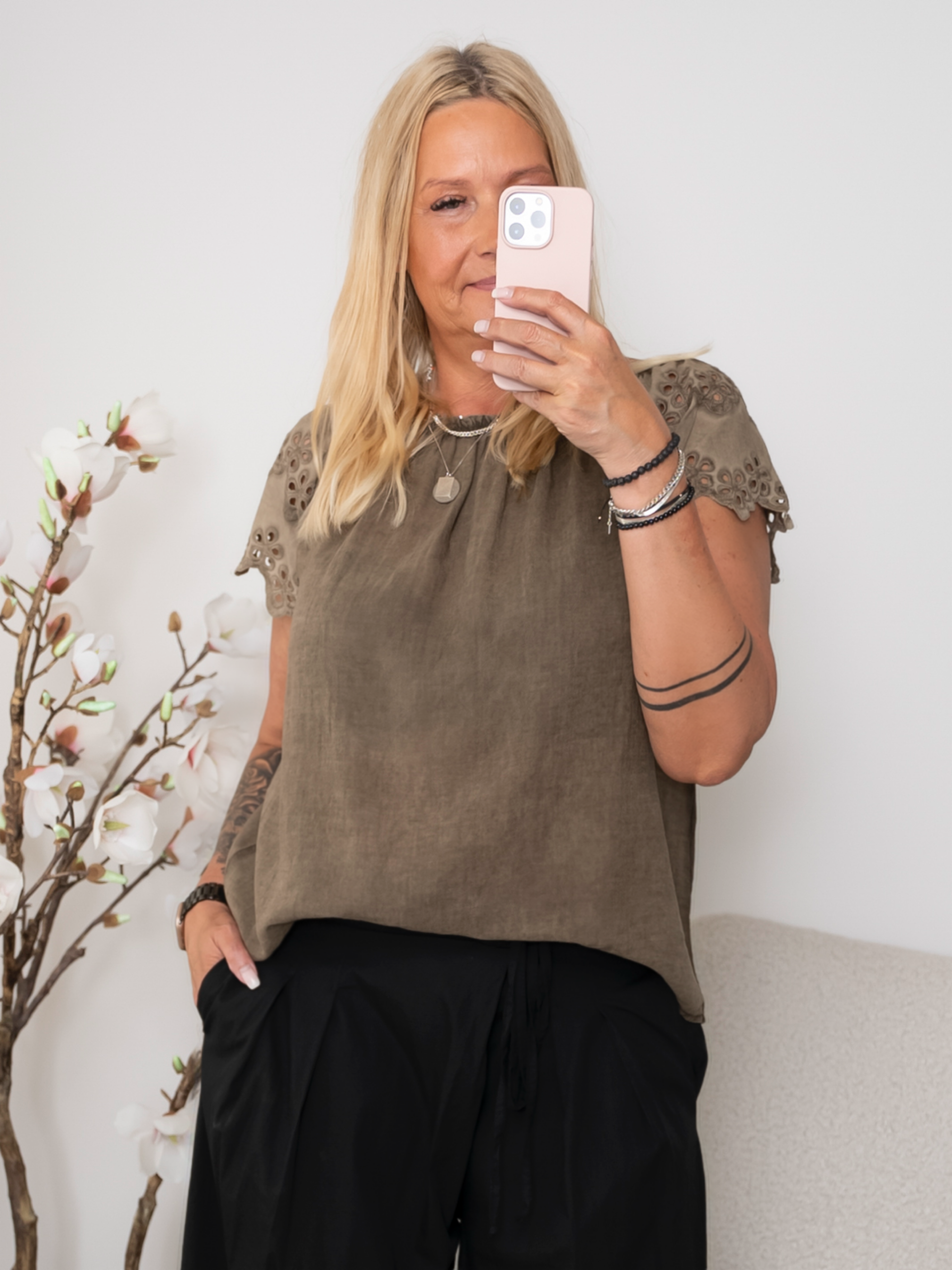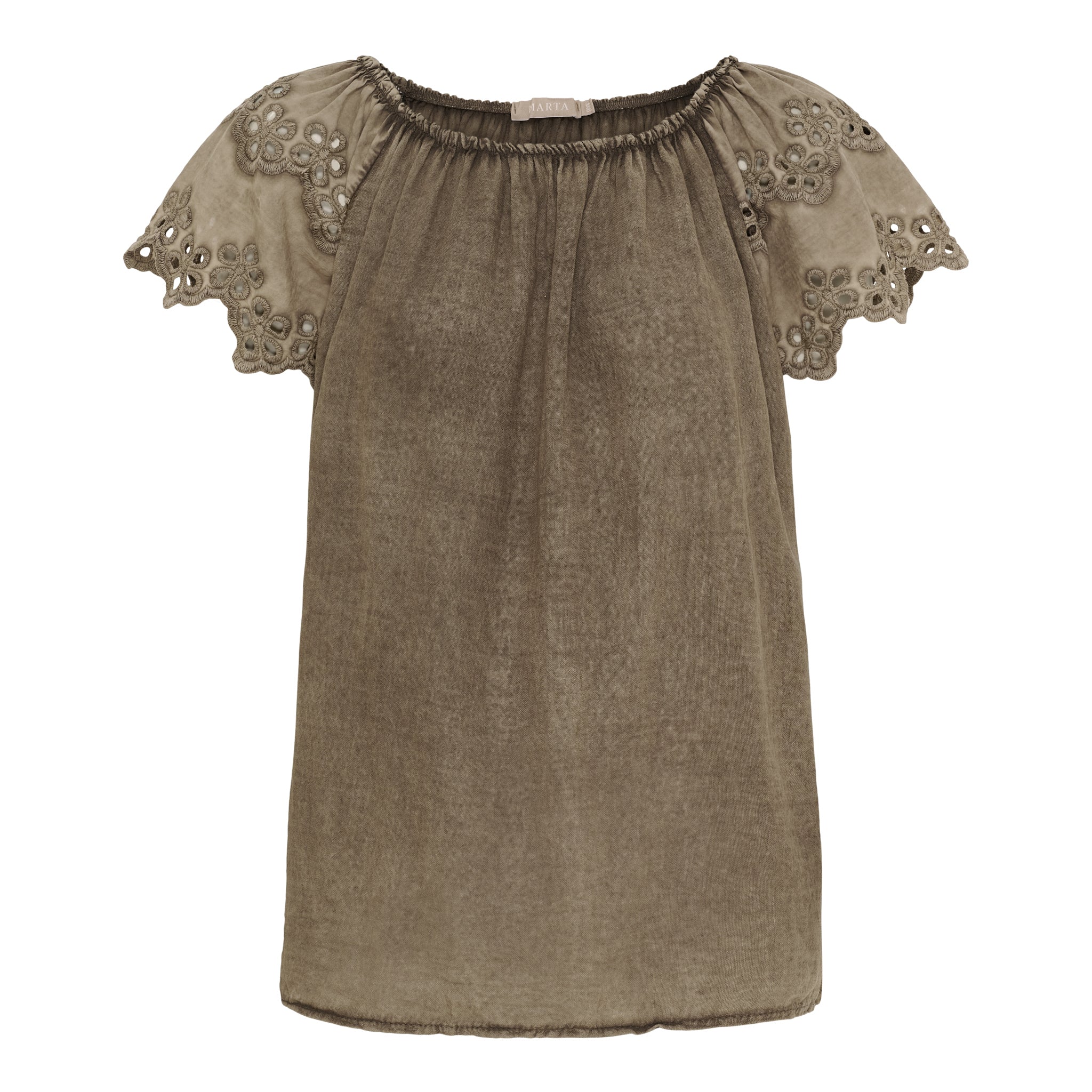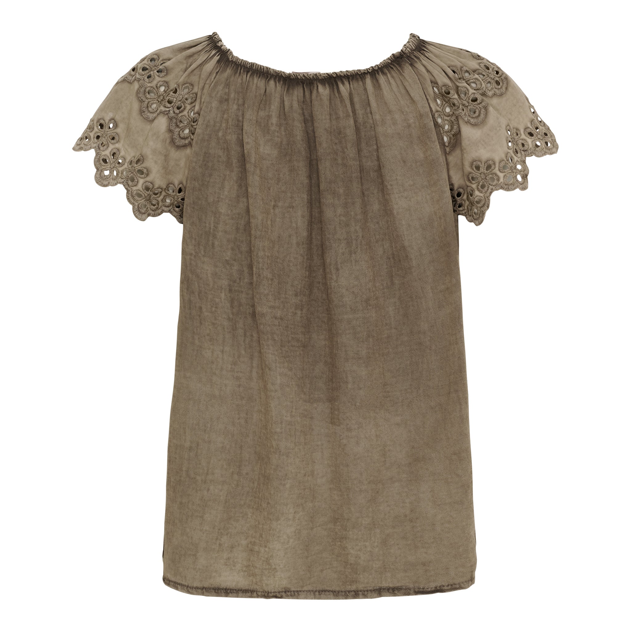 Denne top forener komfort og femininitet på smukkeste vis. Det bløde, luftige materiale falder let om kroppen, mens de korte ærmer med dekorativt broderi og udskæringer tilføjer et elegant og romantisk twist.