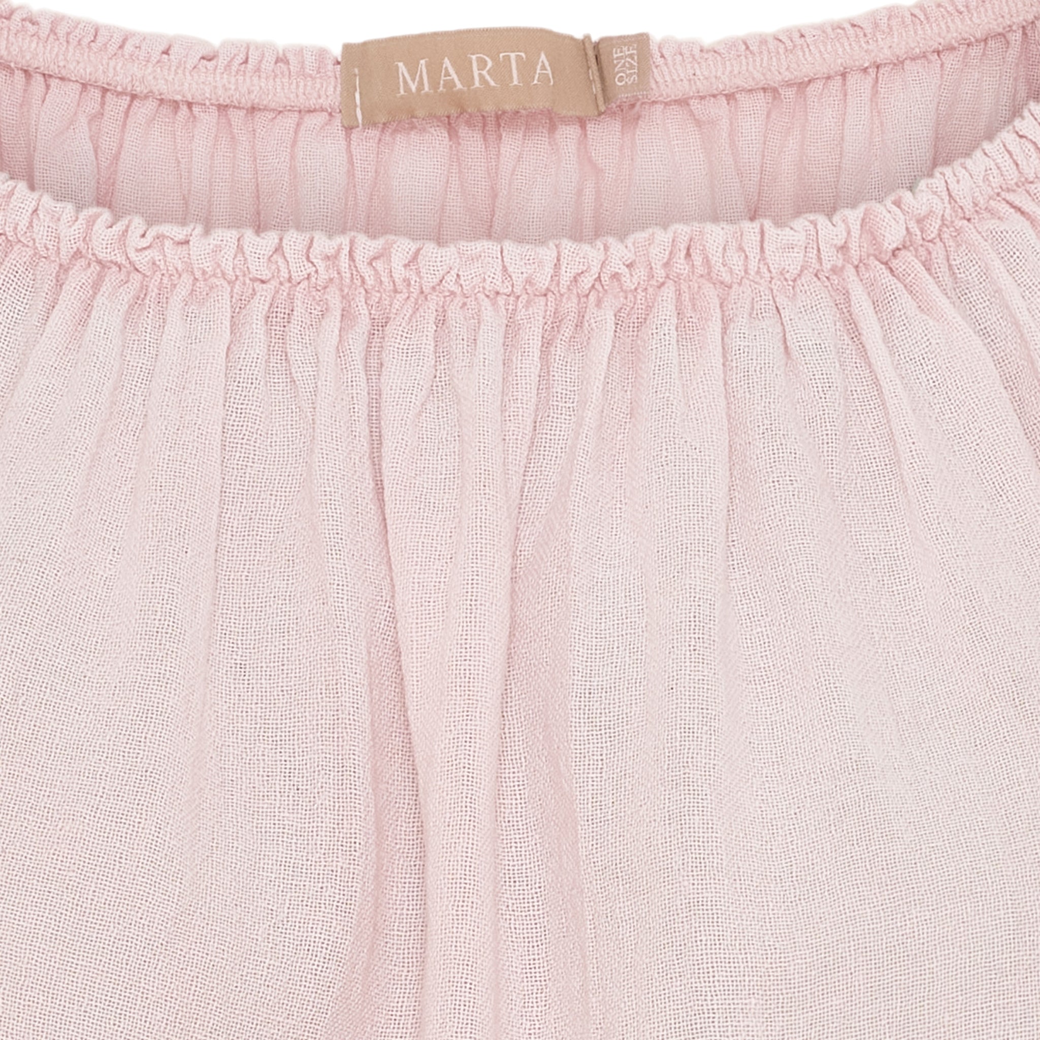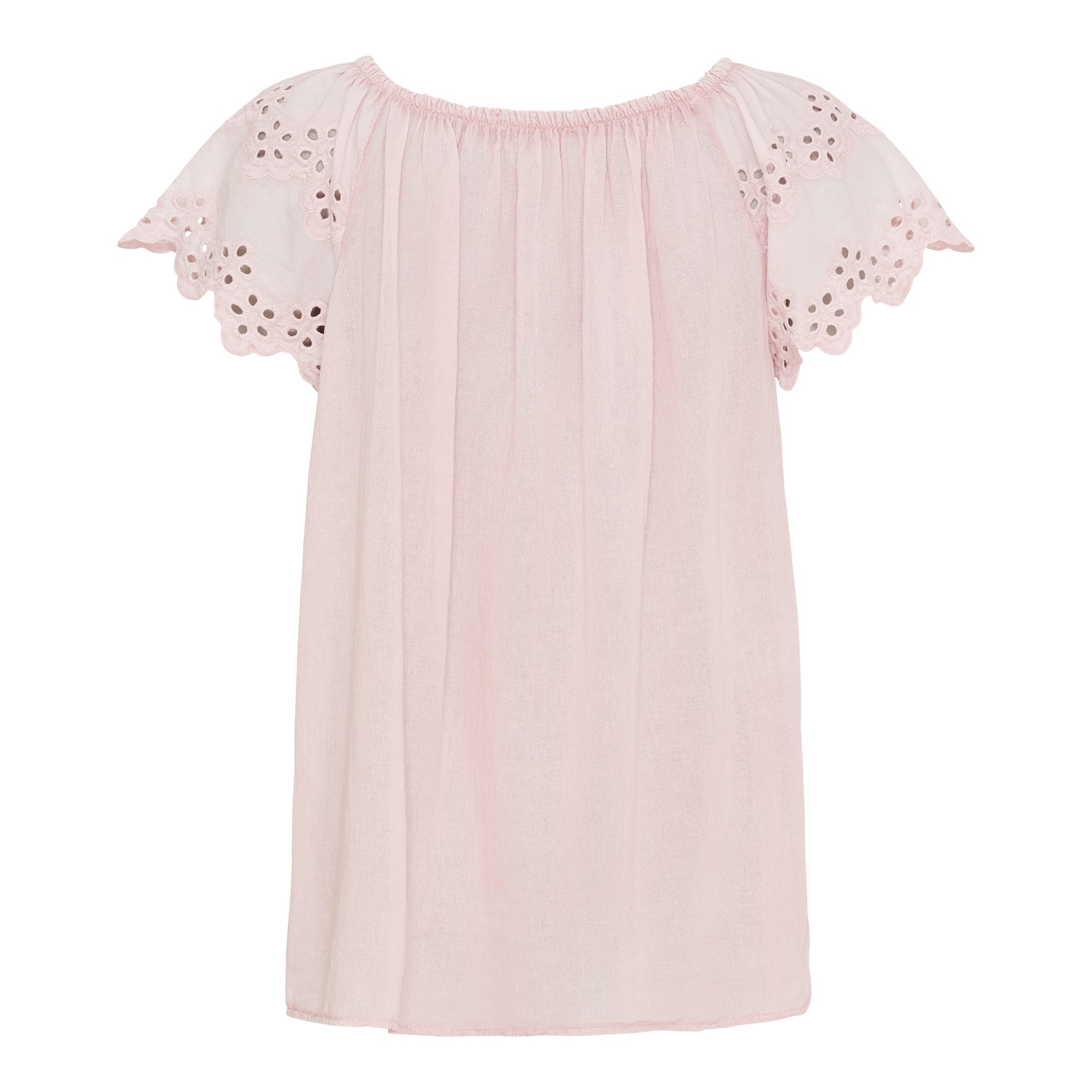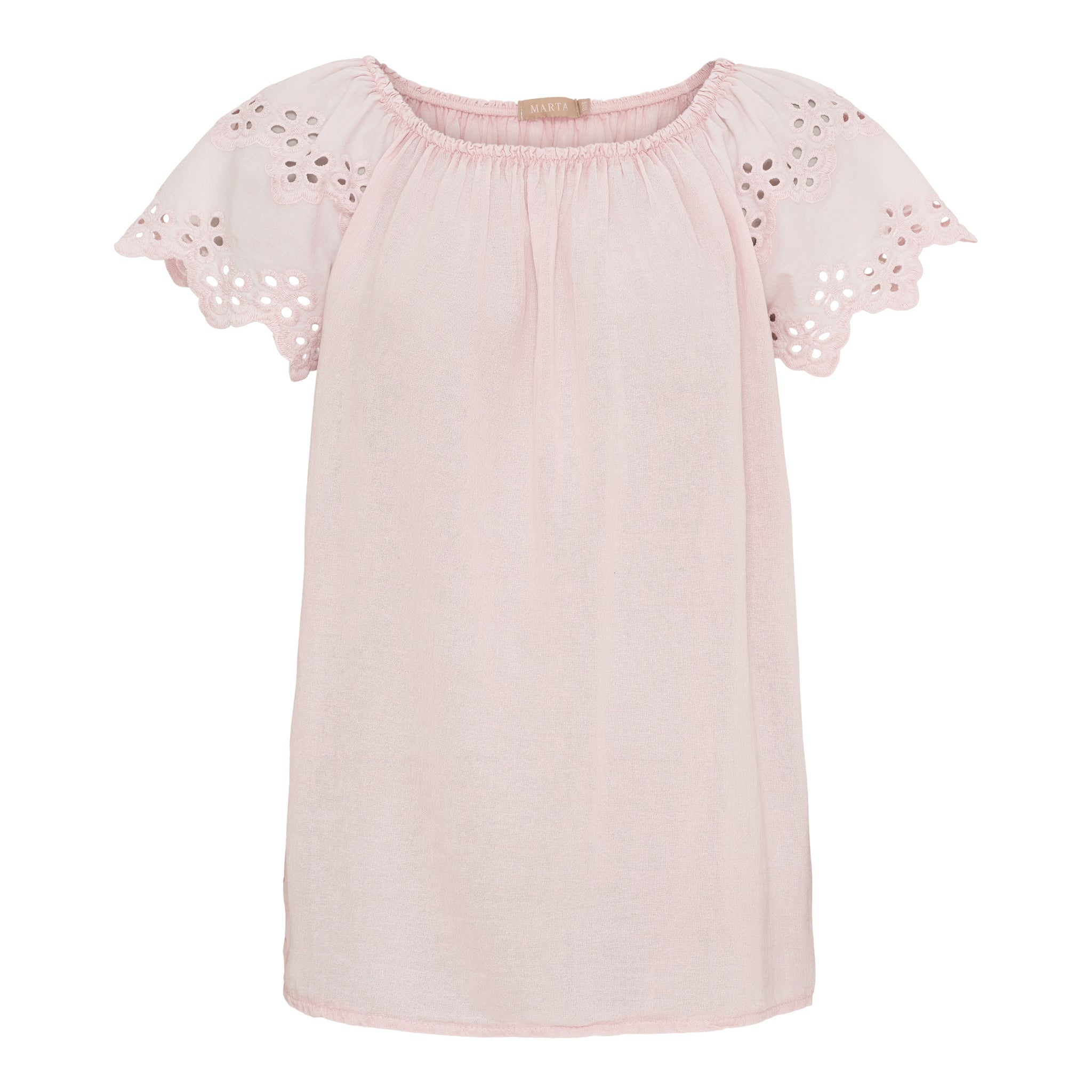 Denne top forener komfort og femininitet på smukkeste vis. Det bløde, luftige materiale falder let om kroppen, mens de korte ærmer med dekorativt broderi og udskæringer tilføjer et elegant og romantisk twist.