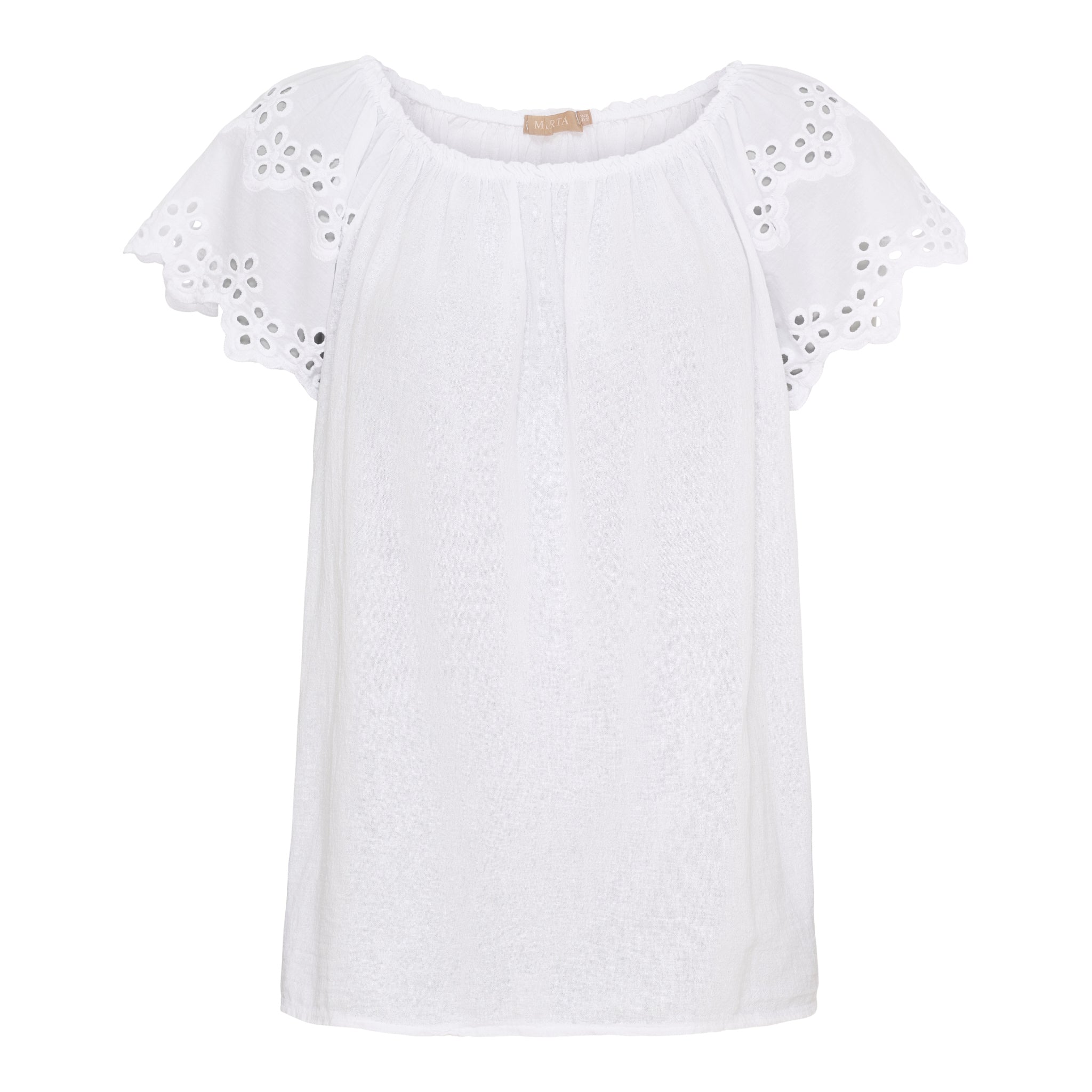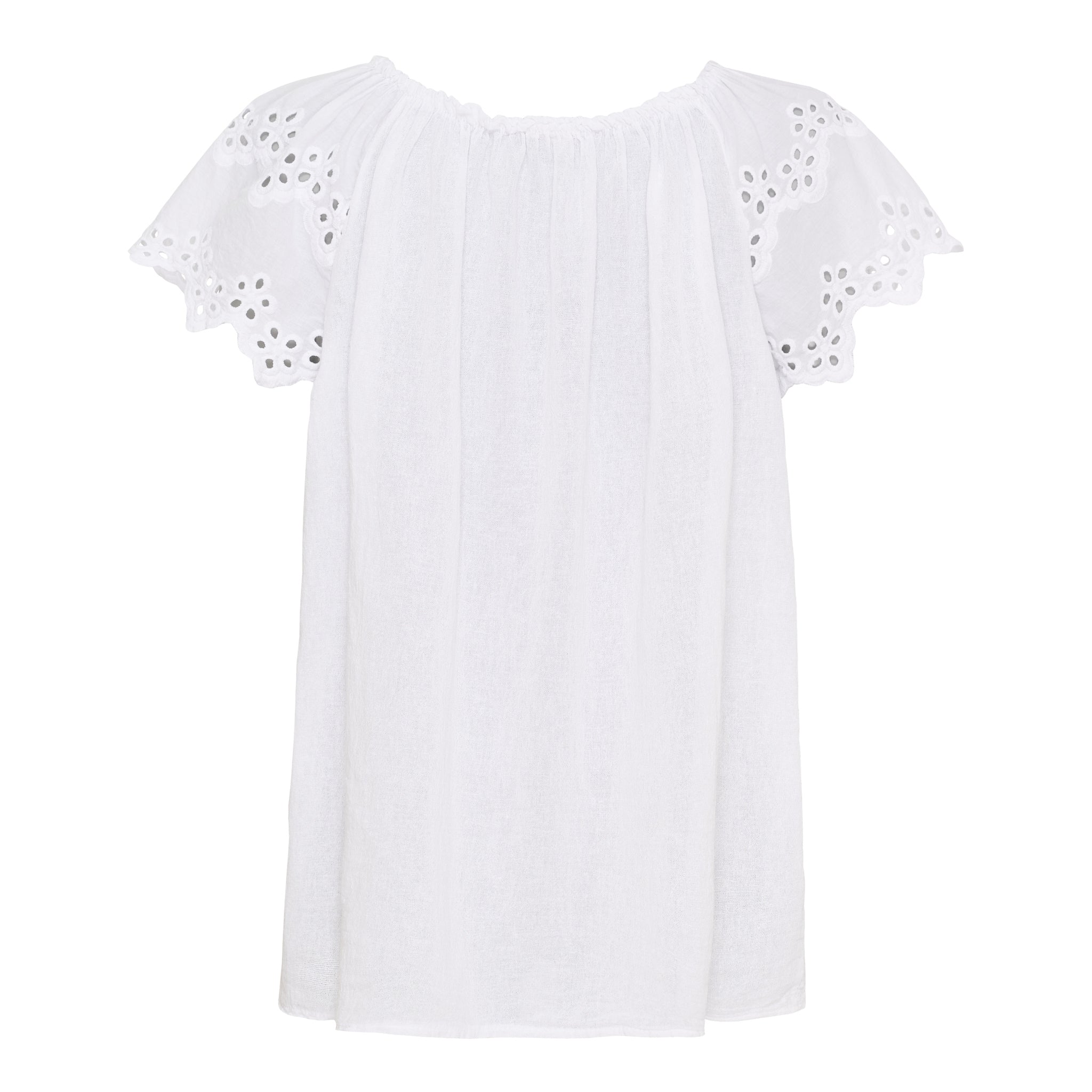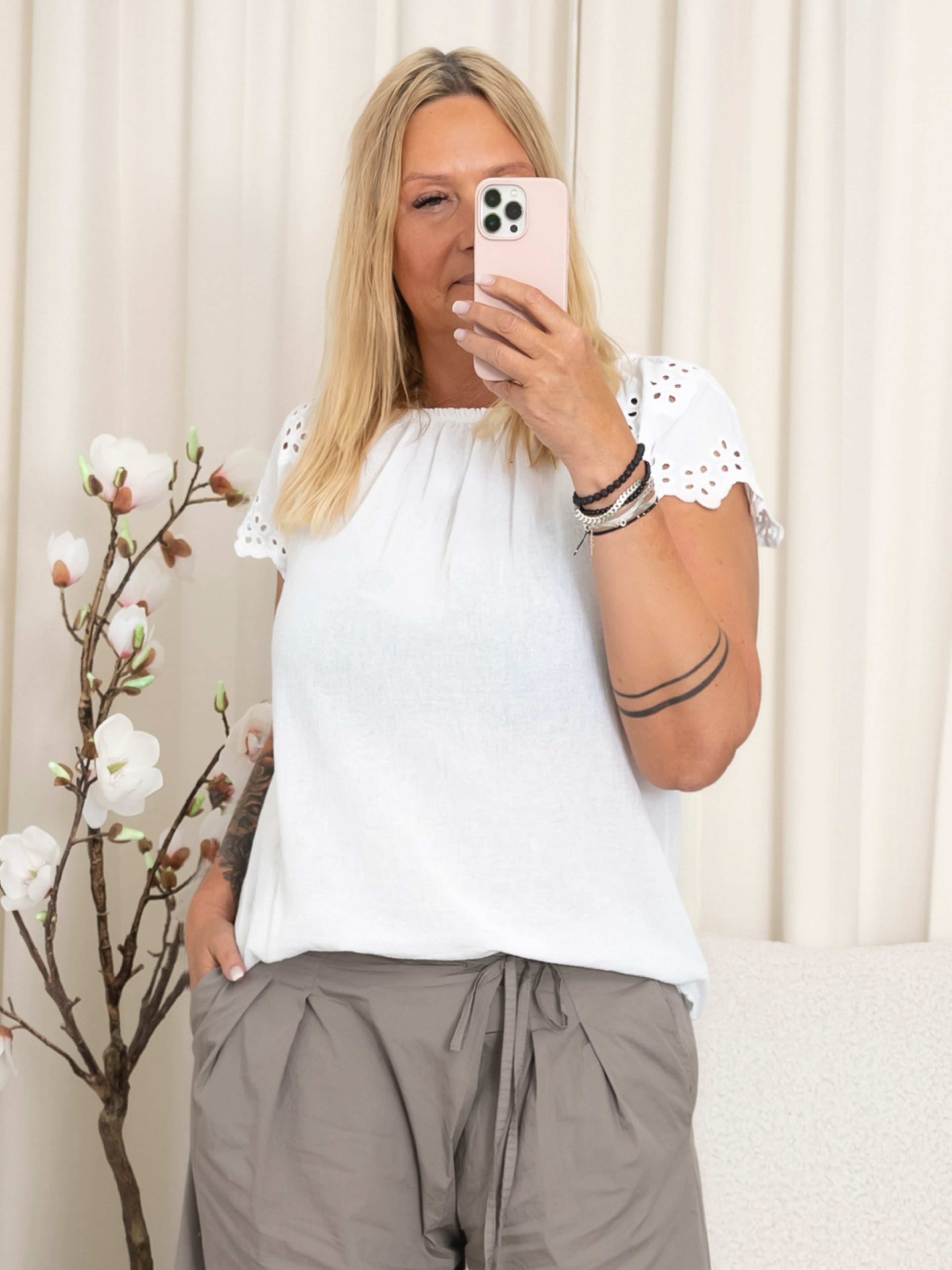 Denne top forener komfort og femininitet på smukkeste vis. Det bløde, luftige materiale falder let om kroppen, mens de korte ærmer med dekorativt broderi og udskæringer tilføjer et elegant og romantisk twist.