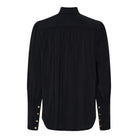Denne skjorte forener klassisk elegance med moderne finesse. Det rene snit og den let løstsiddende pasform giver et tidløst udtryk, mens de fine detaljer som guldknapper og diskrete læg ved skuldrene tilfører feminint raffinement. Det bløde materiale falder smukt og gør skjorten behagelig at have på – hele dagen.