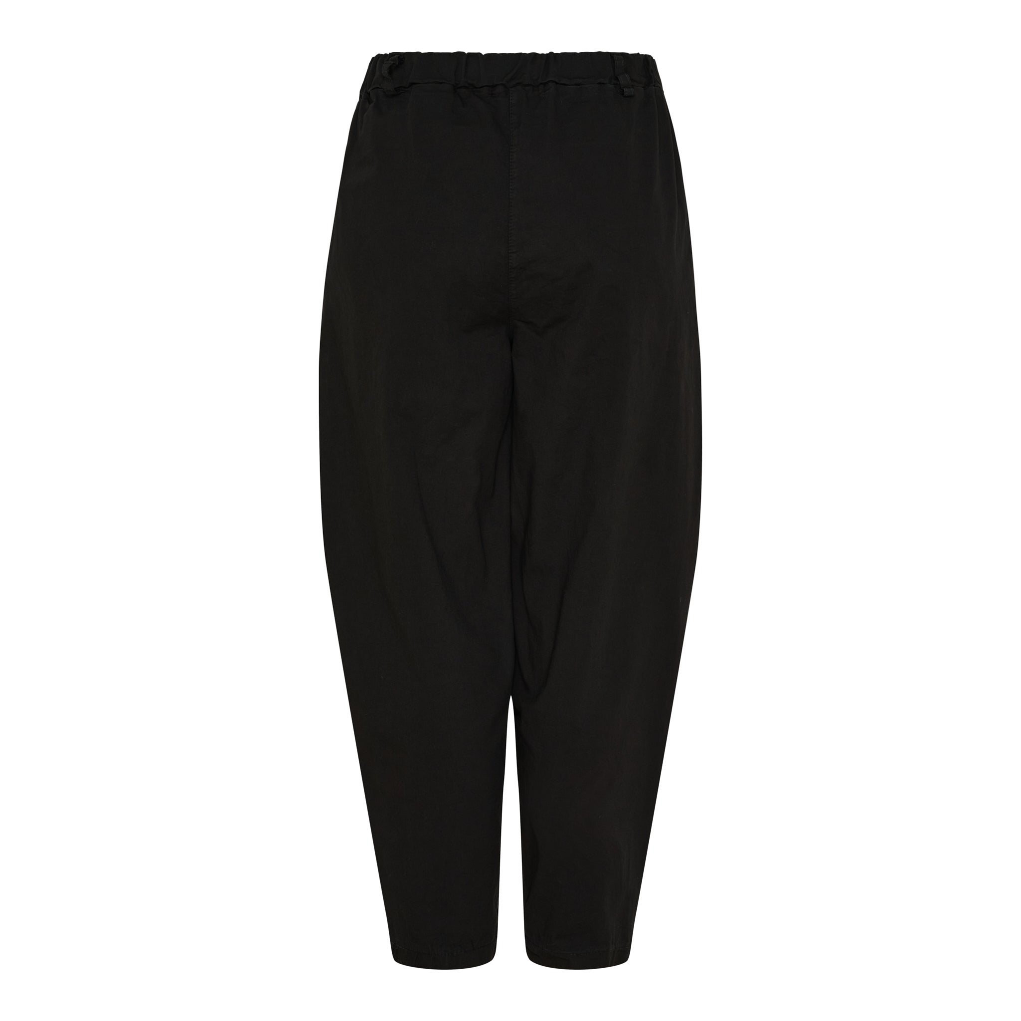 Pasformen er løs med en høj talje, elastik bagpå og bæltestropper, som sikrer både bevægelsesfrihed og mulighed for styling med bælte. De let tilspidsede ben skaber en flatterende silhuet og giver et cool, urbant twist.