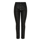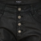 Disse stilfulde bukser kombinerer komfort med et moderne look, der er perfekt til hverdagsbrug og lidt mere pyntede anledninger. Den coatede overflade giver en lækker, let glans og et råt twist, mens det mellemhøje taljestykke og de dekorative knapper tilfører et feminint og unikt udtryk.