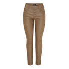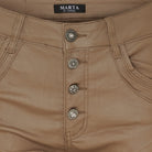 Disse stilfulde bukser kombinerer komfort med et moderne look, der er perfekt til hverdagsbrug og lidt mere pyntede anledninger. Den coatede overflade giver en lækker, let glans og et råt twist, mens det mellemhøje taljestykke og de dekorative knapper tilfører et feminint og unikt udtryk.