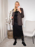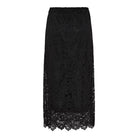 Denne elegante, lange nederdel i blonde skaber et feminint og raffineret look med sit detaljerede mønster og let transparente udtryk. Den tætsiddende pasform kombineret med det bløde underskirt gør den både behagelig og stilfuld.