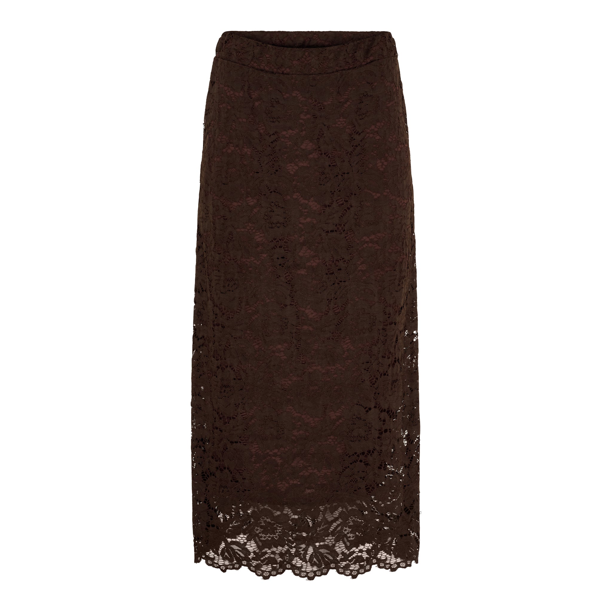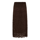 Denne elegante, lange nederdel i blonde skaber et feminint og raffineret look med sit detaljerede mønster og let transparente udtryk. Den tætsiddende pasform kombineret med det bløde underskirt gør den både behagelig og stilfuld.