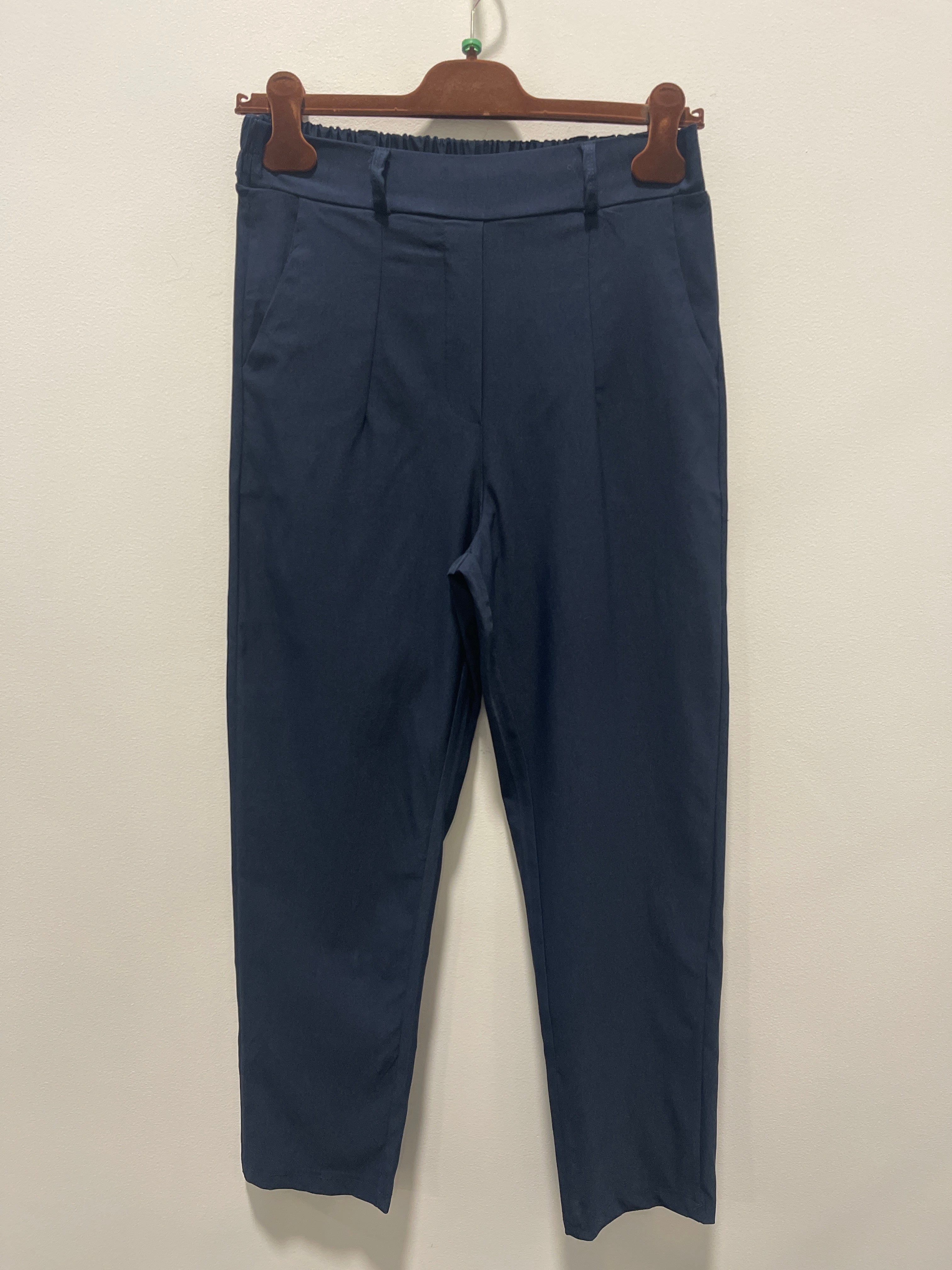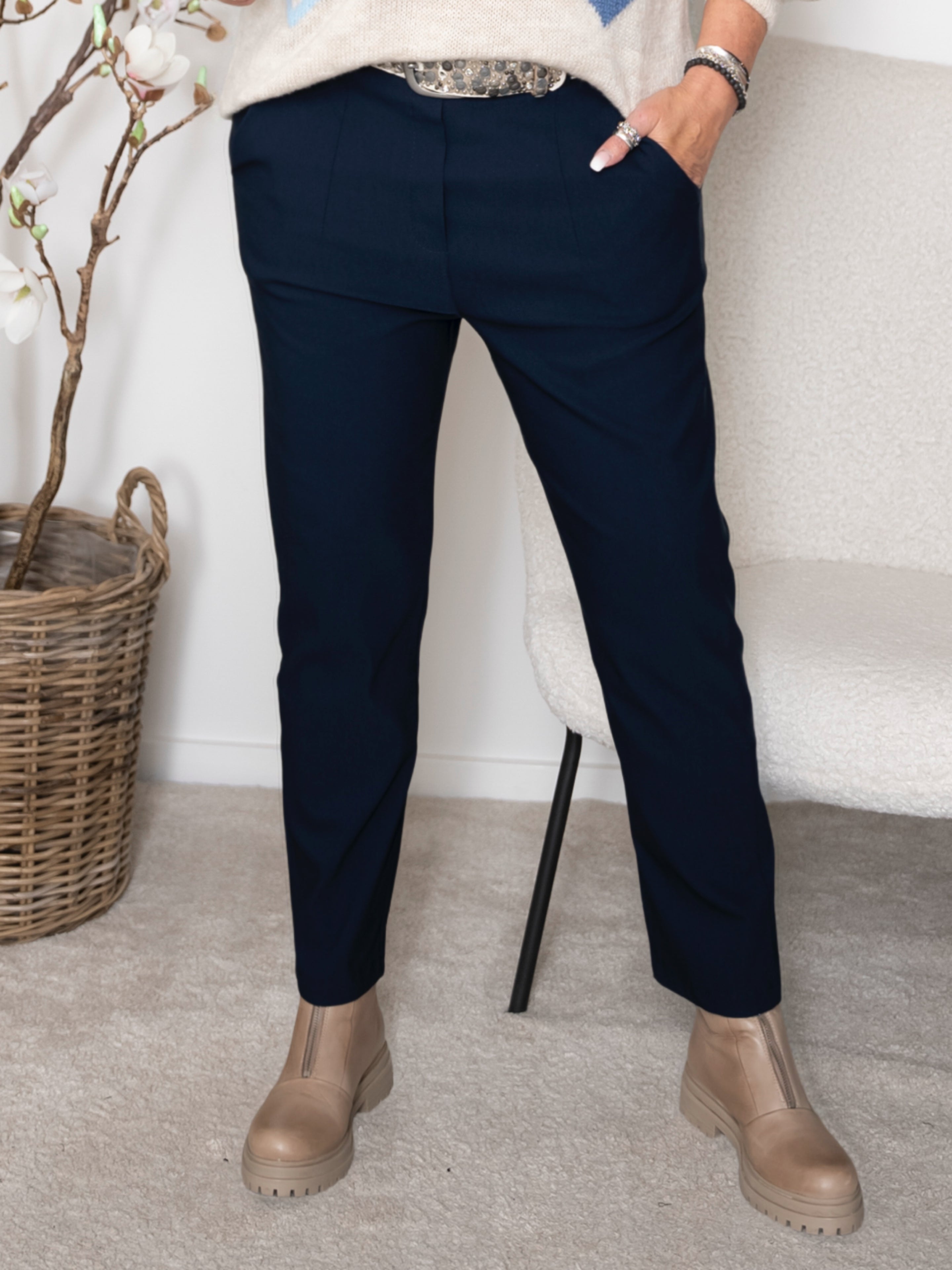 Designet er gennemført med elastik bagpå i linningen og praktiske sidelommer. De smalle ben og 7/8 længde gør bukserne nemme at style med alt fra skjorter til strik og blazere.