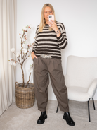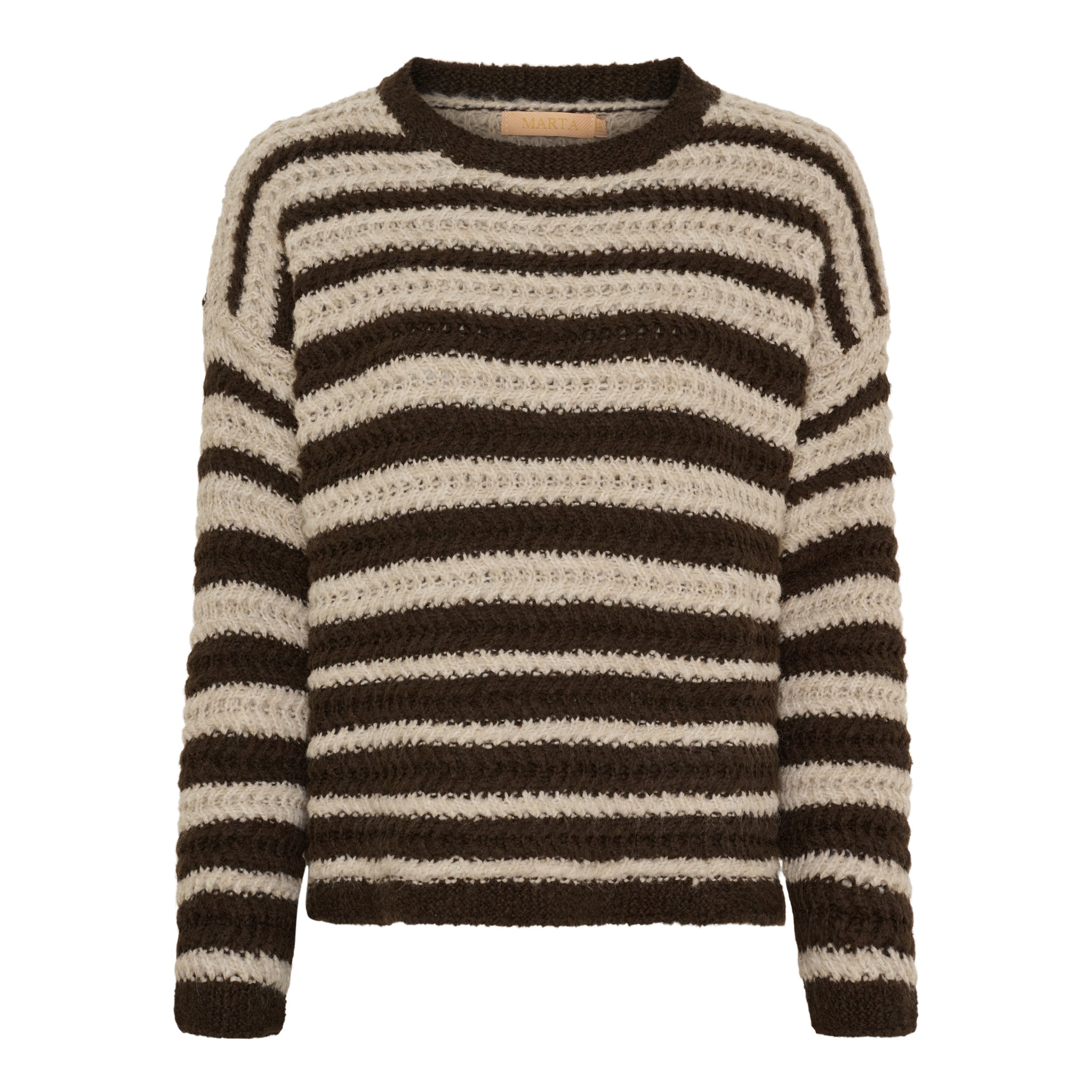 Denne striktrøje er den perfekte kombination af varme og stil. Med sine brede, dekorative striber og det luftige, let fluffy garn får du et hyggeligt, men moderne udtryk, der passer perfekt ind i efterårets garderobe.