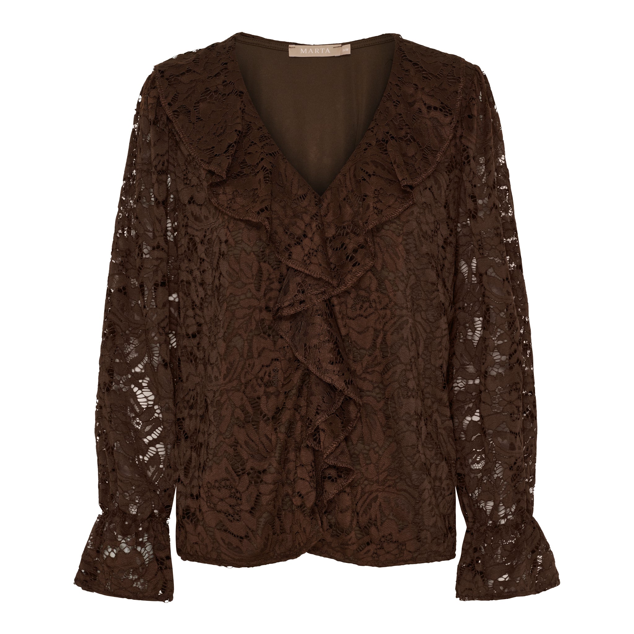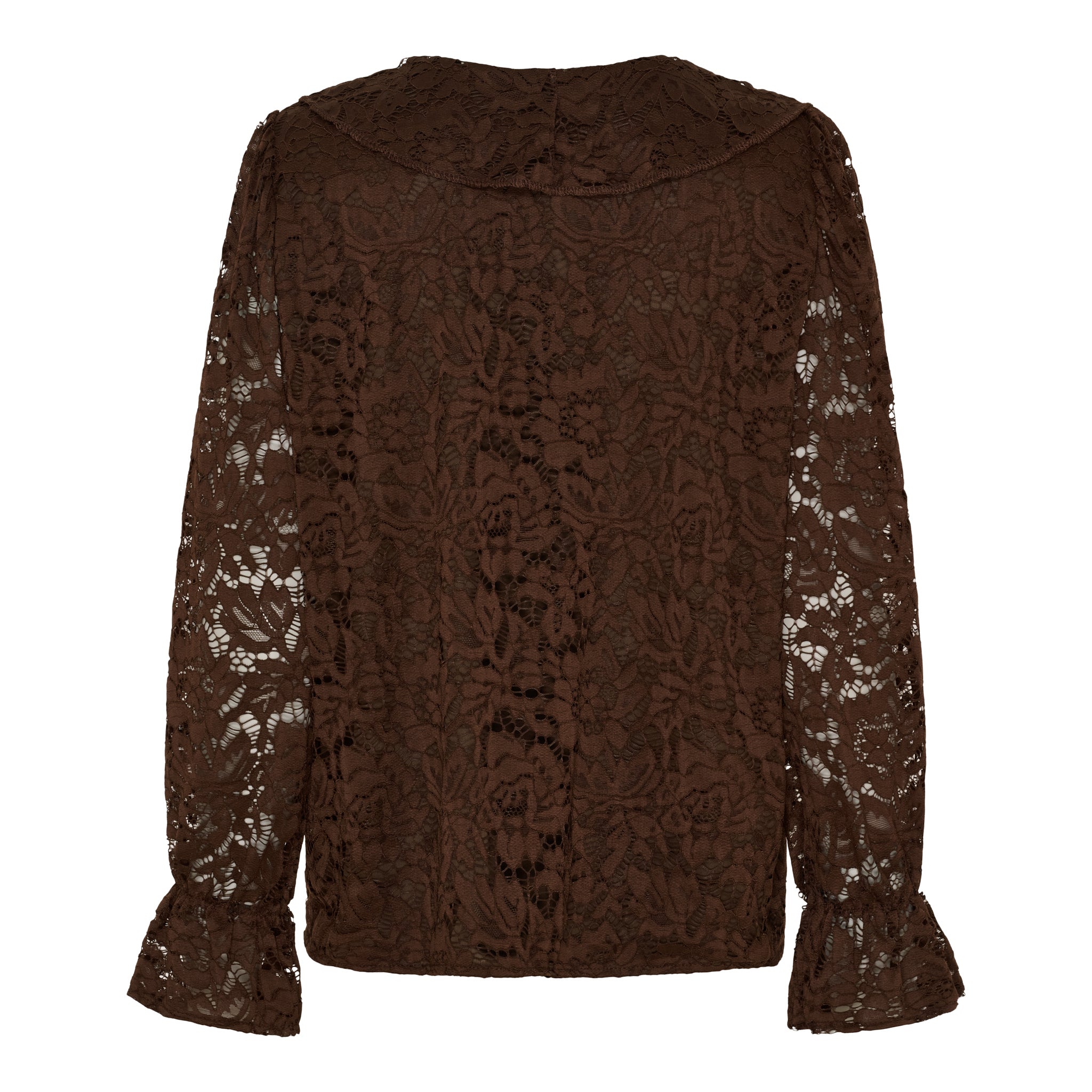 Denne blondebluse forener elegance og romantik i et raffineret design. Den gennemsigtige blondekvalitet skaber et let og feminint udtryk, mens de smukke flæsedetaljer langs udskæringen og fronten tilføjer et dekorativt touch.