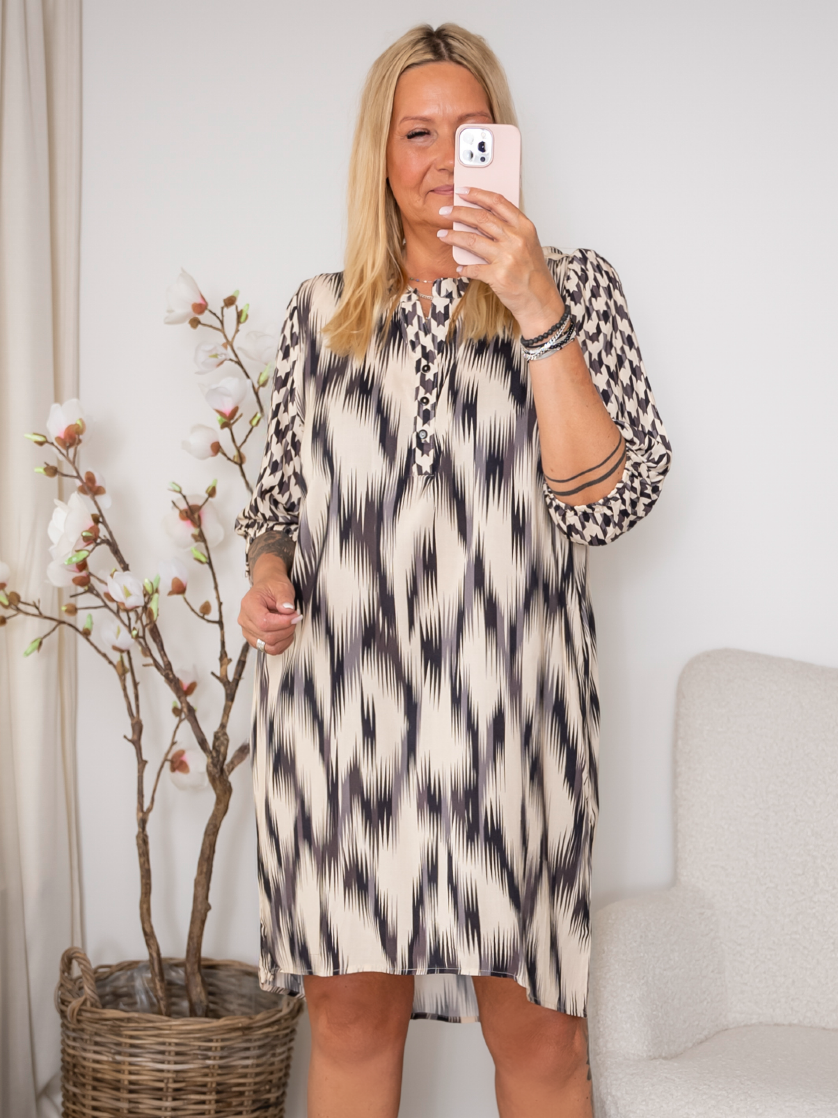 Denne kjole kombinerer komfort med et grafisk, iøjnefaldende design, der får dig til at skille dig ud på den elegante måde. Det sandfarvede og sorte ikat-mønster skaber et stilrent udtryk, mens de kontrasterende ærmer med småmønstret print giver et ekstra twist.